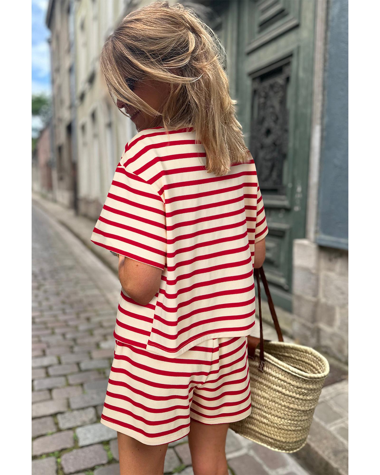 Red Stripe Lace-up Front Top and High Waist Shorts Set - M
