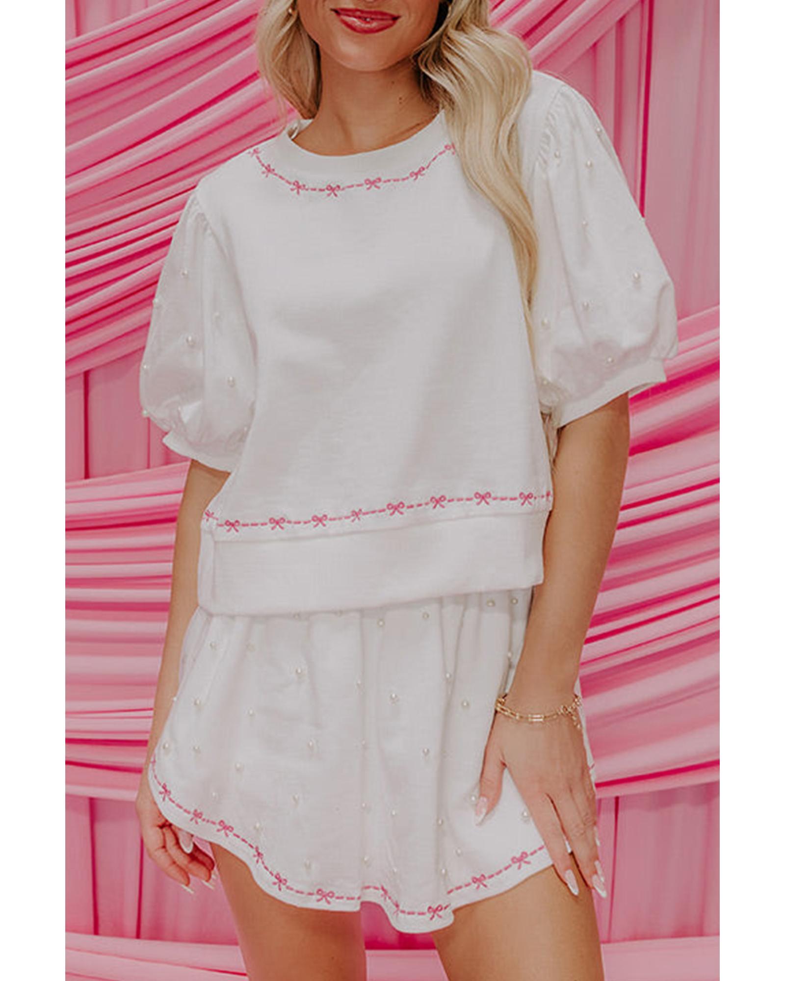 White Contrast Bow Trim Pearl Puff Sleeve Blouse and Skort 2pcs Set - M
